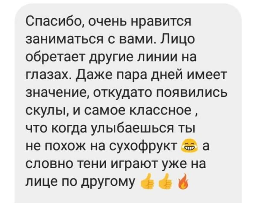 «FaceLifting FINISH» – предназначен для тех, кто прошел «FaceLifting START». Отличается он повышенной нагрузкой, благодаря которой вы закрепите полученный результат тотального лифтинга. Курс уникален своим акцентом на красивые, очерченные скулы и массажем против бруксизма.